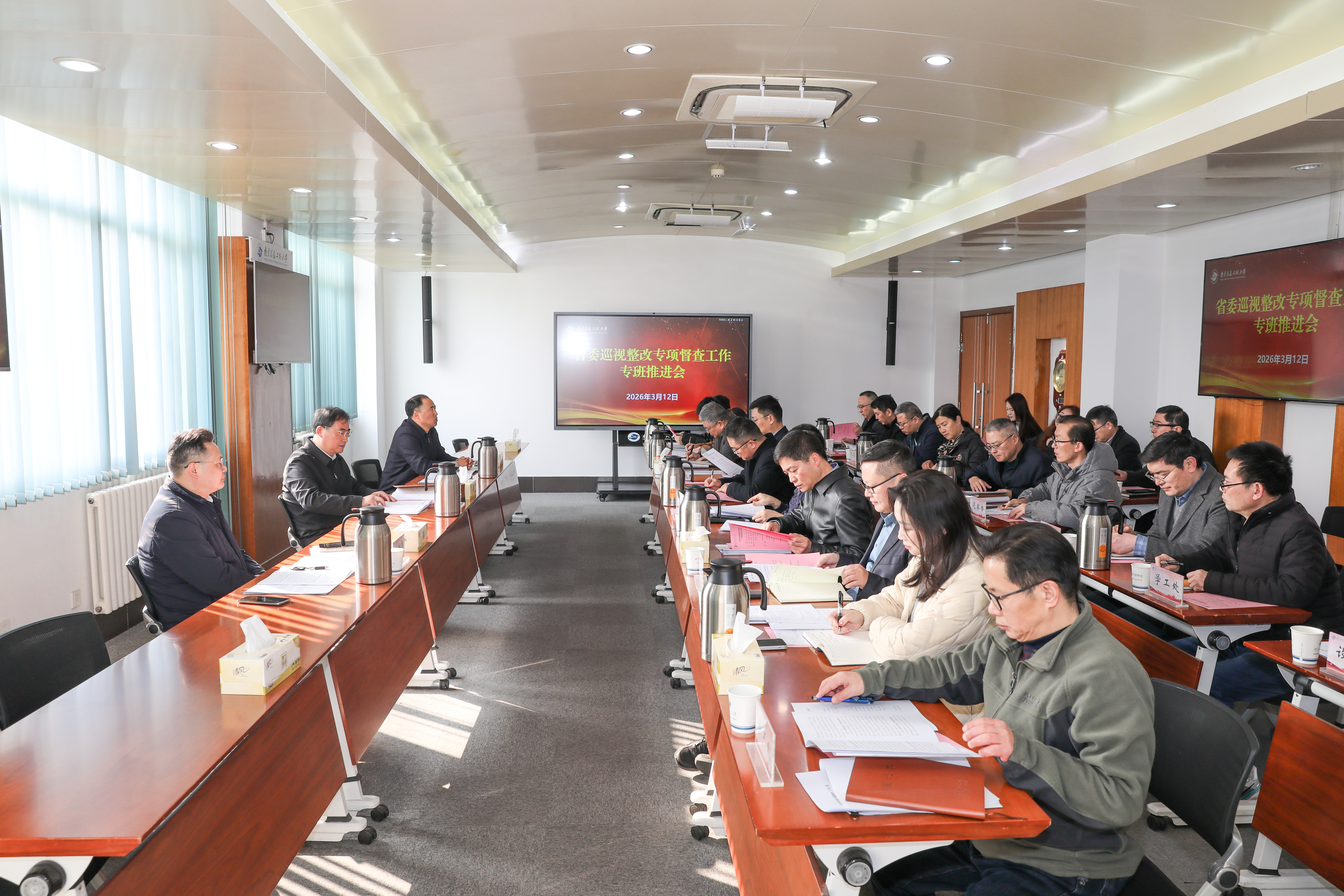 3月12日上午,我校在行政楼529会议室召开省委巡视整改专项督查工作专班推进会。校党委书记尚洪波,党委副书记王培君(正厅级),省纪委监委派驻南京信息工程大学纪检监察组组长、党委常委、纪委书记、二级高级监察官沈新奎出席会议。工作组有关单位负责人、整改牵头单位负责人参加会议。会议由王培君主持。