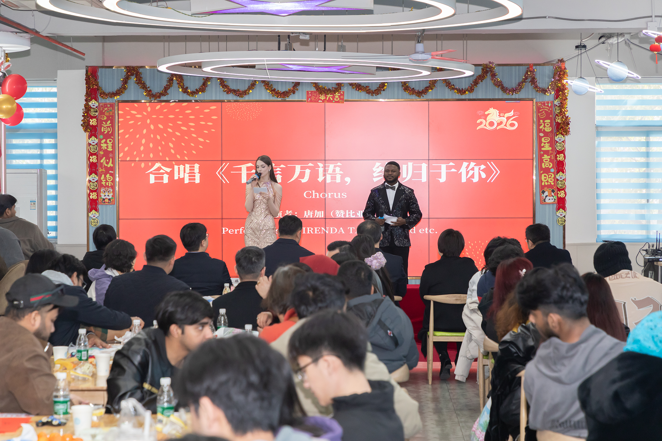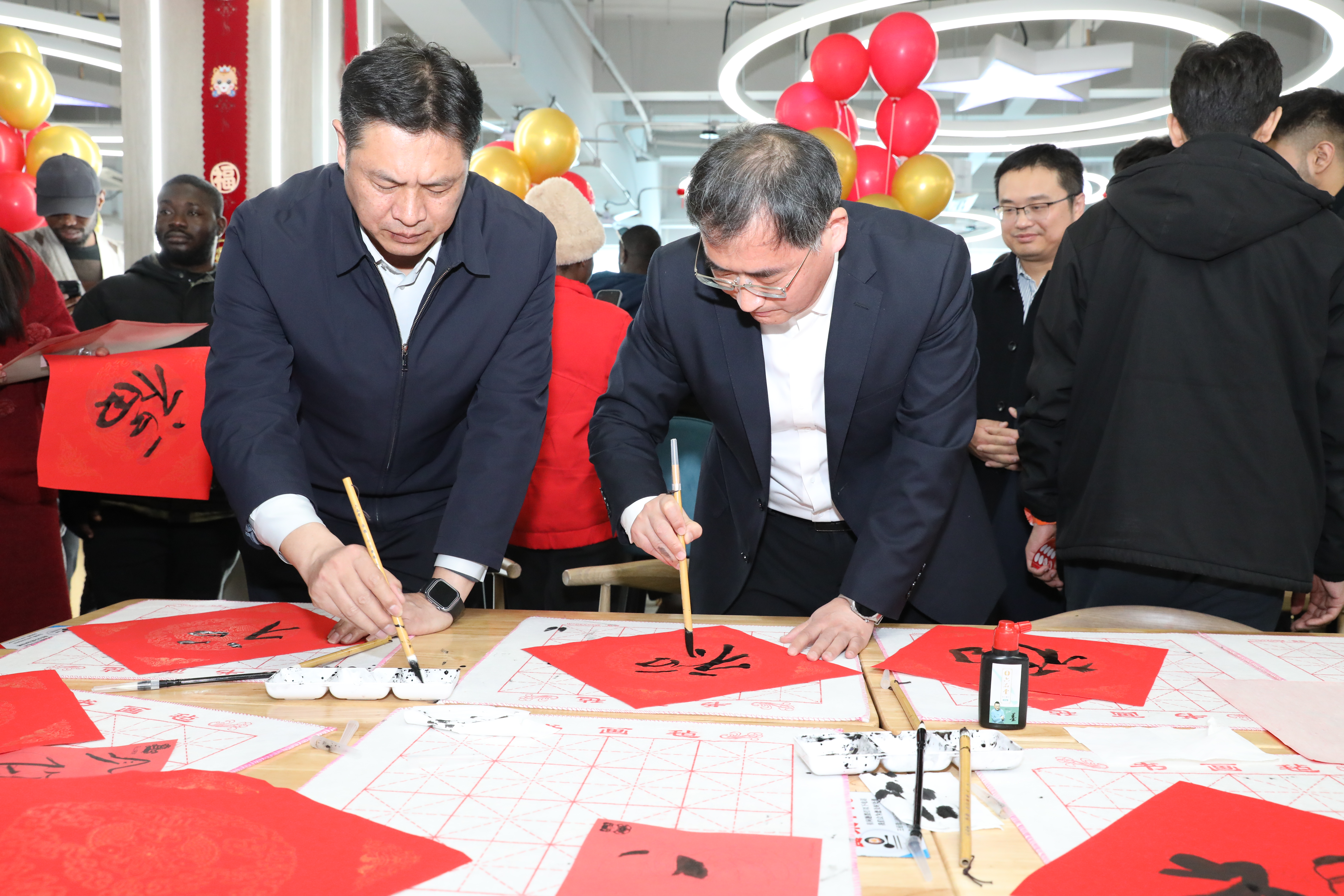 下午,中苑老食堂二楼年味浓郁、热闹非凡,2026年“骏马贺新春·‘信’彩中国年”春节联欢游园会在此举行。校领导尚洪波、陈海山、刘佳、章炎麟,以及相关部门负责人、留校中外师生欢聚一堂,共同迎接丙午马年的到来。活动由国际教育学院承办。