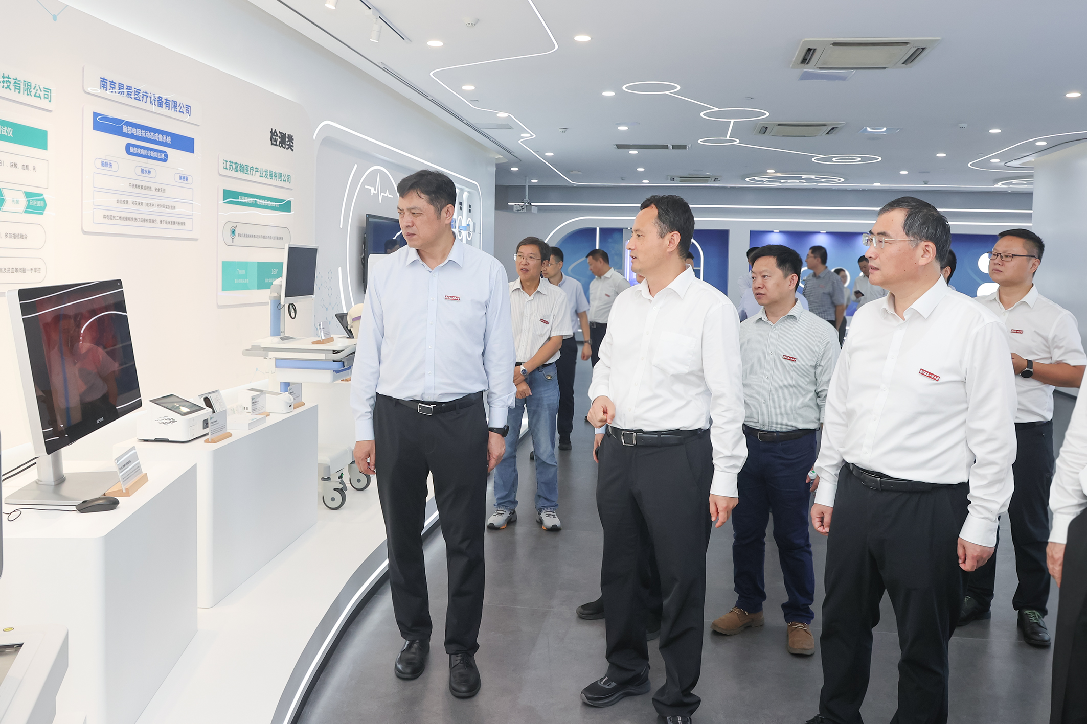 在南京生物医药谷展厅,调研组重点关注药谷与高校、科研院所的合作模式,以及在科技成果转化、创新企业孵化等方面的经验做法。详细了解新区在生命健康领域的技术突破与产品创新成果,并围绕人工智能、医疗大数据等领域的科研优势与产业转化潜力展开深入交流。