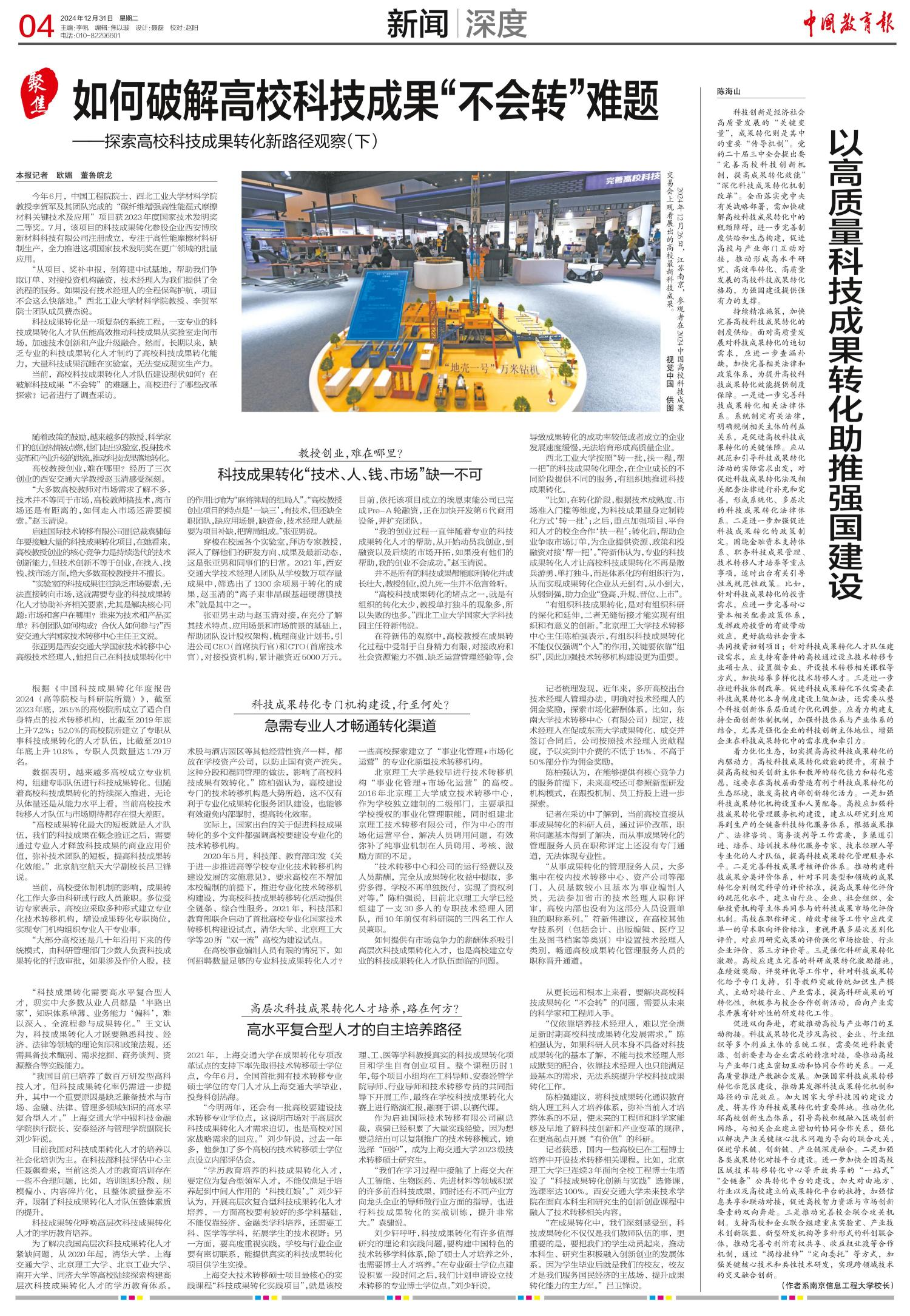 科技创新是经济社会高质量发展的“关键变量”,成果转化则是其中的重要“传导机制”。党的二十届三中全会提出要“完善高校科技创新机制,提高成果转化效能”“深化科技成果转化机制改革”。全面落实党中央有关战略部署,需加快破解高校科技成果转化中的瓶颈障碍,进一步完善制度供给和生态构建,促进高校与产业部门互动对接,推动形成高水平研究、高效率转化、高质量发展的高校科技成果转化格局,为强国建设提供强有力的支撑。